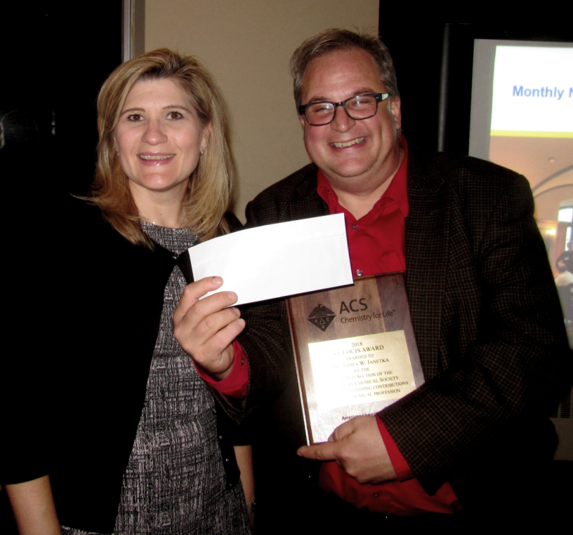 The 2018 Saint Louis Award Banquet in honor of Professor James Janetka of Washington University–St Louis, was held on Friday November 2, at the Glen Echo Country Club. There were over 50 people in attendance, including current and former postdoctoral associates of Dr Janetka and graduate and postdoctoral students from the Department of Chemistry, as well as faculty and staff from local universities and companies. The open bar that preceded the meal and proceedings, with candied bacon and veggie-stuffed mushroom caps, gave an opportunity for socializing and gossip. Two posters and a slide show promoting the Saint Louis Local ACS section were on display, the handiwork of past-Chair Natalie LaFranzo.