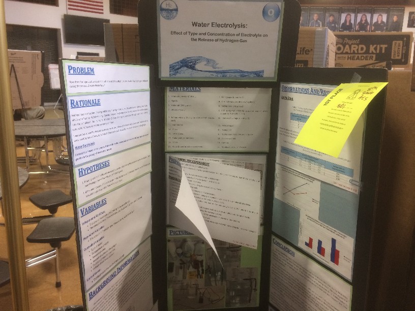 First Place: Gunnika Singh, Grade 5, West Middle School, MO: Water Electrolysis: Effect of type and concentration of electrolyte on the release of hydrogen gas
