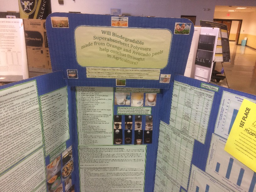 Second Place: Lakshita Senthil, Grade 9, Fort Zumwalt West High School, MO: Will Biodegradable Superabsorbent Polymers made of Orange/Avocado peels help Combat Drought in Agriculture?
