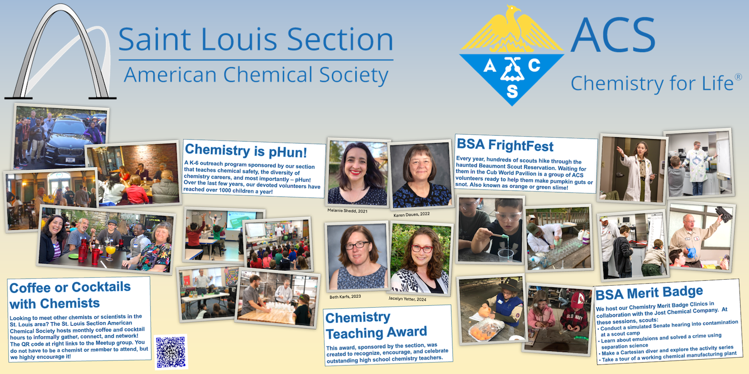 As you can see from the poster we put up, this award is a testament to you, our members, and your commitment to both the chemical sciences and our broader community. I commented many times at the Local Section reception at SciMix, where the poster was also displayed: There are many more activities and volunteers among our 1200 members in the St. Louis area that go unrecognized, if you are one of those people, please reach out to our editorial team at editor@stlacs.org.